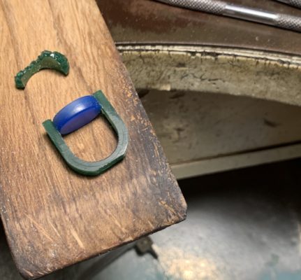 指輪の腕部分は硬めのグリーンワックスで、トップの石座部分は柔らかめのブルーワックスで加工しました。